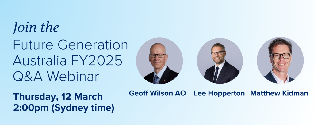We’ll be joined by Geoff Wilson AO, Founder and Director of Future Generation, Lee Hopperton, our Chief Investment Officer and Matthew Kidman, Co-Founder and Portfolio Manager at Centennial Asset Management. During the webinar, we’ll discuss the full year results, our diversified investment portfolio, latest market insights and answer shareholder questions.